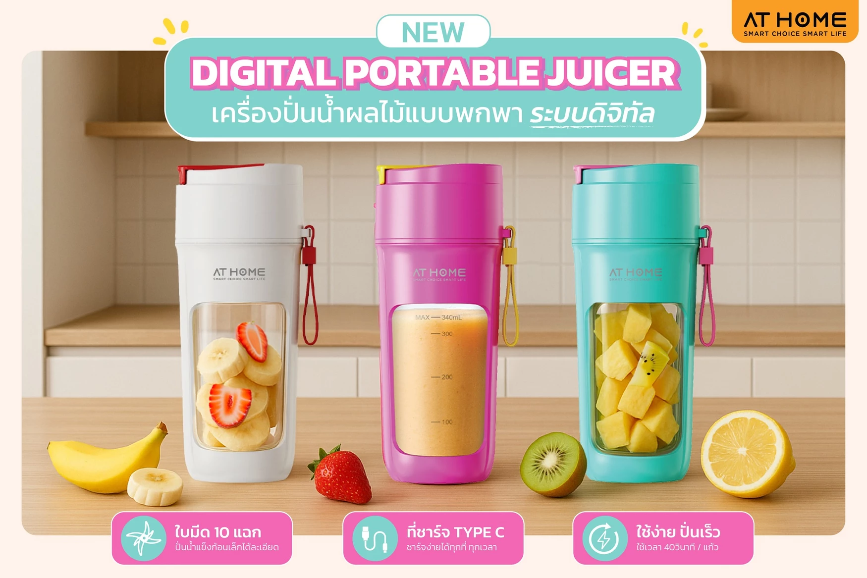 ทำไมต้องเลือก AT HOME เครื่องปั่นน้ำผลไม้แบบพกพาระบบดิจิทัล